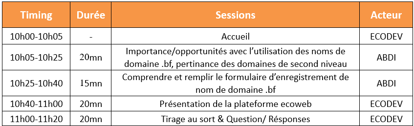 Informer les participants sur les avantages de l’utilisation des noms de domaines «.bf» argumenter le choix d’un nom de domaine local (.bf) à la place des noms de domaines génériques. Inspirer et éduquer les participants sur l’impact positif des domaines «.bf», tout en fournissant des conseils pratiques pour pleinement tirer profit des extensions «.bf»